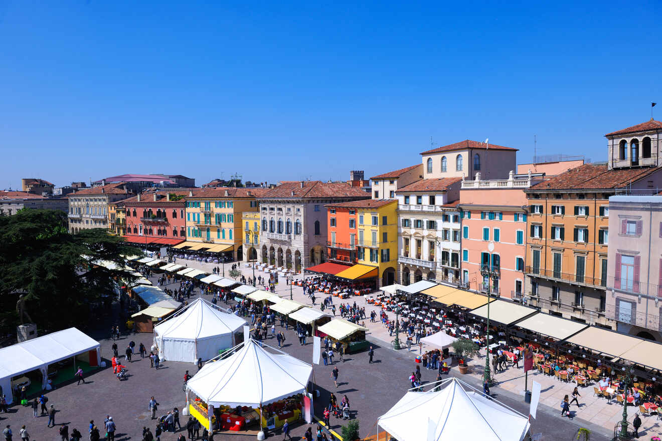 Verona’daki tarihi yolculuk şehrin en eski meydanı olan Piazza delle Erbe’de devam ediyor. Bir zamanlar Roma İmparatorluğu döneminde şehrin forumu olan meydan, günümüzde Orta Çağ’dan kalma binalar, canlı kafeler ve mağazalarla çevrili hareketli bir pazar yeri olarak kullanılıyor. Meydan, Verona’nın tarihinin zengin dokusuna katkıda bulunan Madonna Verona Çeşmesi, Lamberti Kulesi ve freskli Mazzanti Evleri gibi birçok önemli simge yapıya ev sahipliği yapıyor.